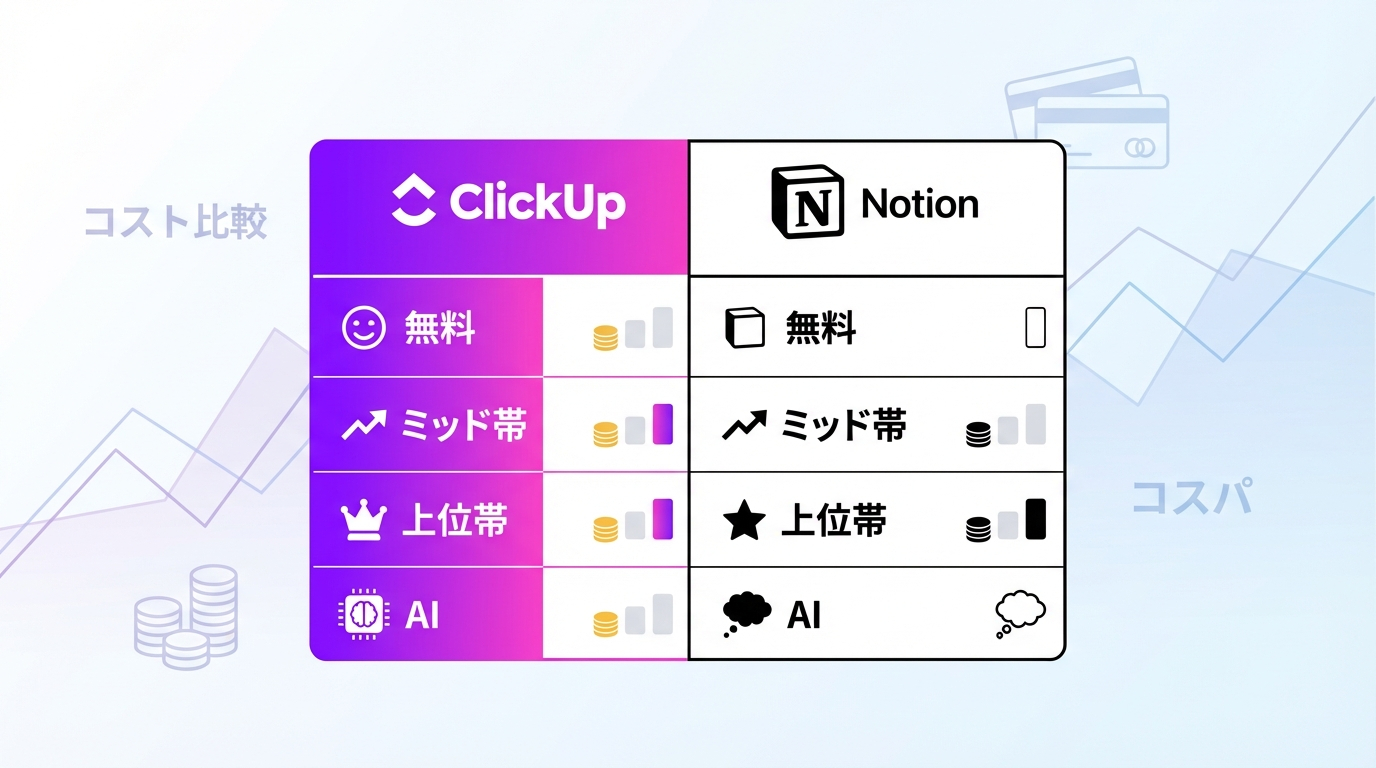 IntroIndexClickUpとNotionは「思想」が違うClickUp:プロジェクト管理(タスク)起点の“運用設計”が強いNotion:ドキュメント(知識)起点の“情報設計”が強い迷ったら:あなたの「主語」がどっちかで決める料金プラン比較【2026年最新】まず押さえるポイント(料金比較の見方)ざっくり早見(目安)AI料金は「チーム全員に付けるか?」で体感が変わるタスク管理・AI機能の違いタスク管理:ClickUpは“最初からPMツール”、Notionは“作り込めるDB”ClickUp(タスク管理が強い)Notion(タスク管理は“自由設計”で強くなる)AI:ClickUpは“運用の補助”、Notionは“文章・知識の補助”で効くClickUp Brain(AI)Notion AI(AI)日本語対応と使いやすさUI・操作の学習コストテンプレ/事例の豊富さ“ストレス”が出やすいポイント(体感)まとめRelated ArticlesRecent Posts
